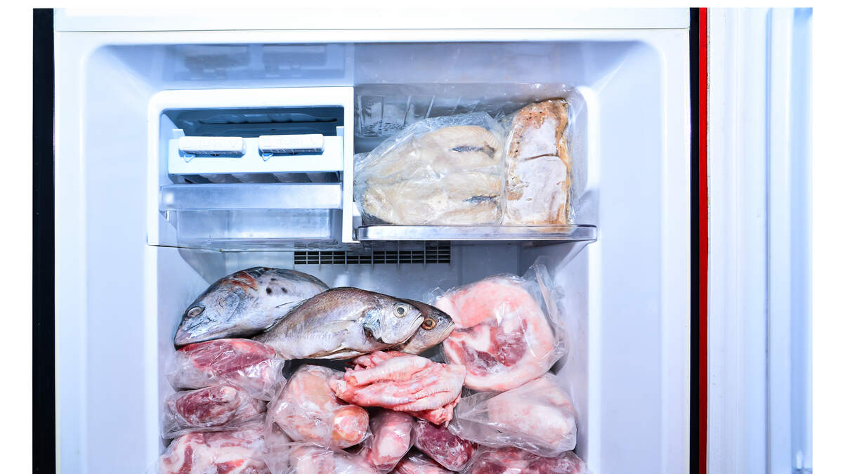 Many meat in refrigetator freezer isolated on white background. Closeup lot of raw pork, fish, meat and chicken in freezing compartment